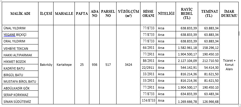 Aşağıda bilgileri verilen taşınmazda; 6306 sayılı Kanun’un 6. maddesinin 1. fıkrasına istinaden yeni yapılacak uygulamaya ilişkin hisseleri oranında maliklerin en az 2/3 çoğunluğu ile karar alınmış ve karara katılmayan Ünal YILDIRIM, Yegane BİÇKİCİ, Oral YILDIRIM, Vehbiye TEKCAN, Hakkı ALTIPARMAK, Hikmet BOZOK, Kadiye BATU, Birgül BATU, Mustafa Birol BATU, Abdülkadir GÖK, Serap KORKMAZ ve Sinan SÜDÜTEMİZ arsa payının açık artırma usulü ile satışı Müdürlüğümüzden talep edilmiştir. Müdürlüğümüzce söz konusu malikin arsa payının açık artırma usulü ile satışının 07.01.2020 tarihinde saat 10.00’da yapılmasına karar verilmiş ve 7201 sayılı Tebligat Kanunu’na göre bütün maliklere bildirimde bulunulmuştur.